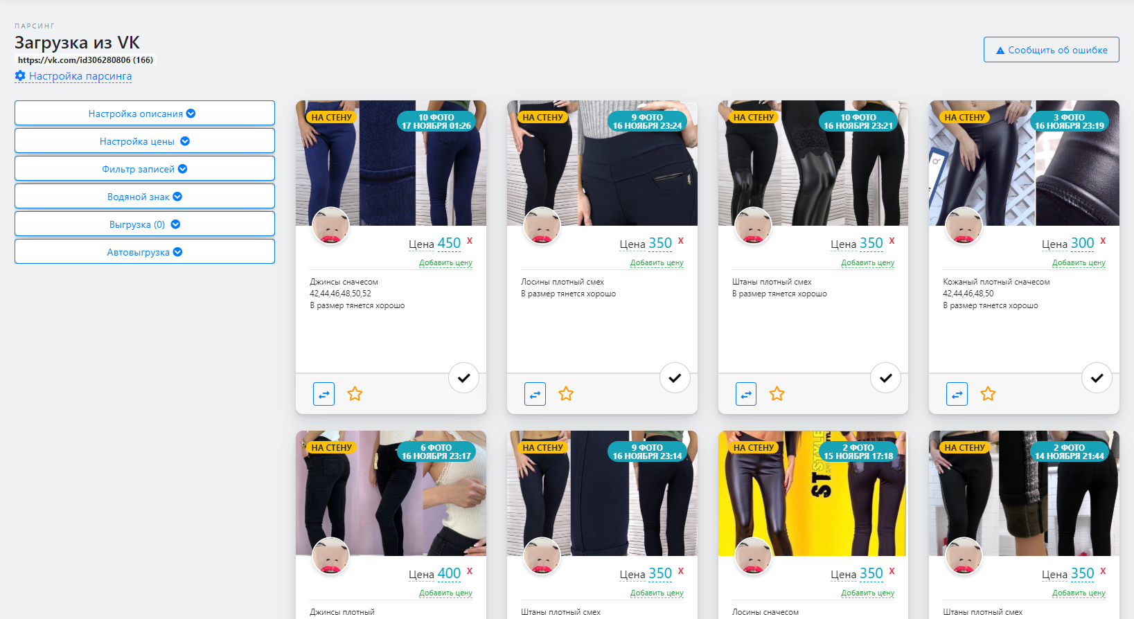 Вы указываете ссылку на страницу или альбом поставщика и сервис выводит все записи с фото и описанием в виде удобных плиток, карточек товара: