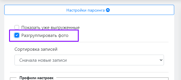 Для разгруппировки раскройте меню "Настройка парсинга" и поставьте галку "Разгруппировать фото".