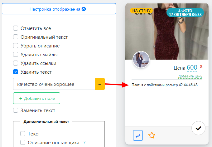 Для удаления текста из описания всех записей воспользуйтесь разделом "Удалить текст":