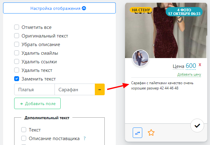 Эта опция включает описание сохранненого поставщика из раздела "Поставщики". Если Вы сохранили поставщика и добавили описание, то при включении этой опции, оно будет добавлено к описанию товара.