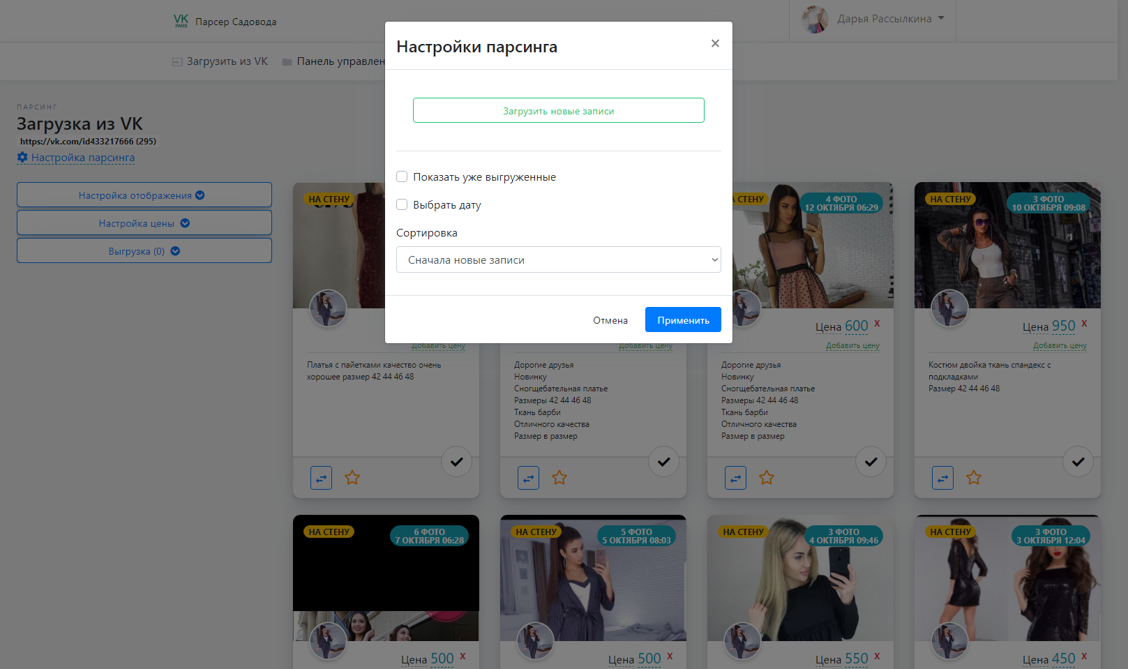 Выгрузка товаров в VK