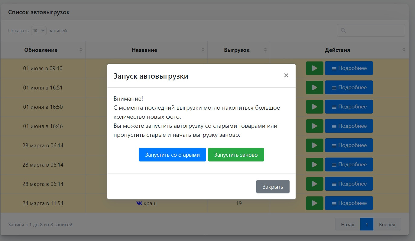 Действия - кнопка Включения/Остановки автовыгрузки, кнопка "Подробнее" с развернутой информацией об автовыгрузке.