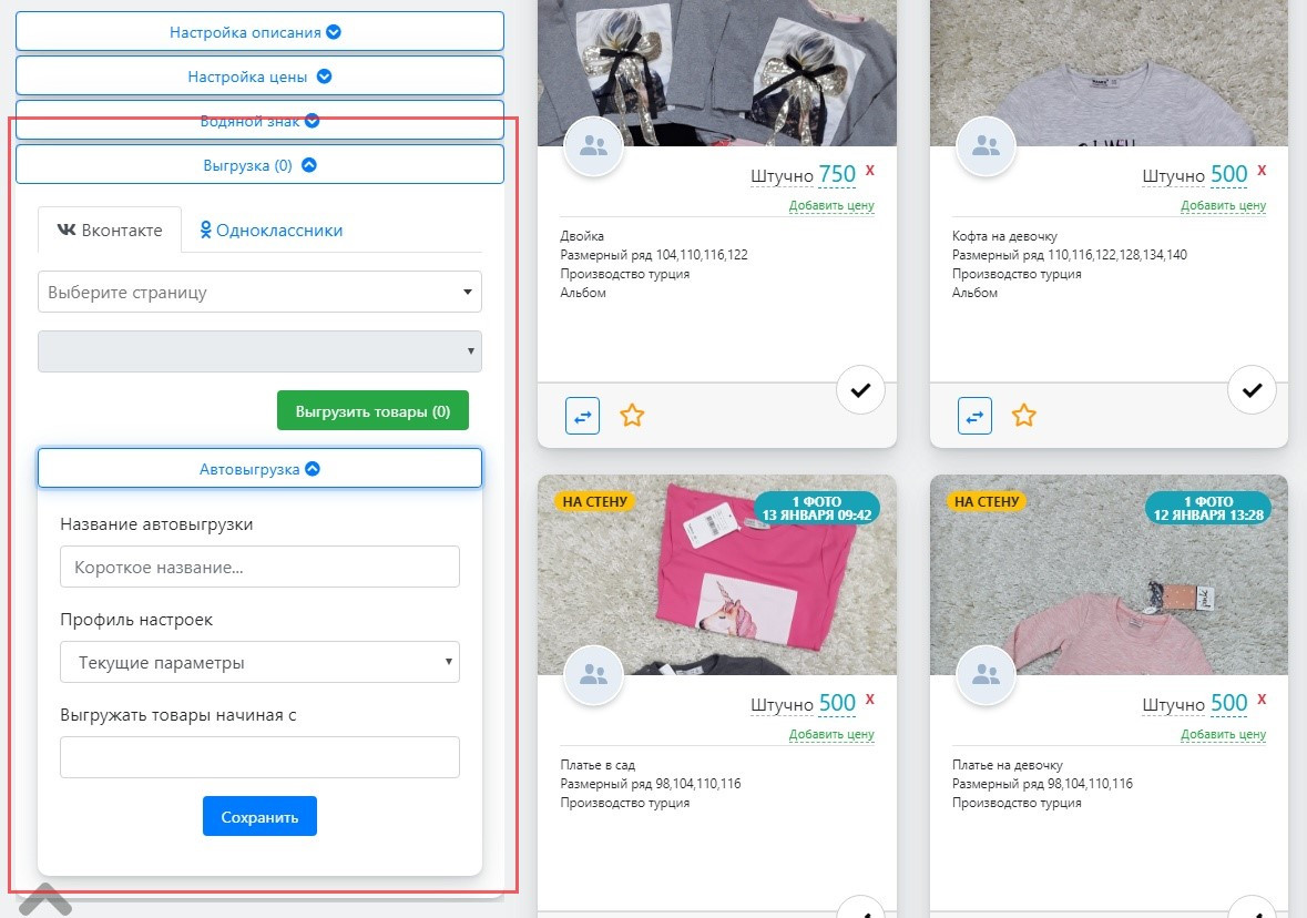 3. В меню "Выгрузка" выбрать альбомы назначения. Вы можете выбрать сразу две соц сети, в таком случае будет создано две автовыгрузки: в ВК и в ОК.