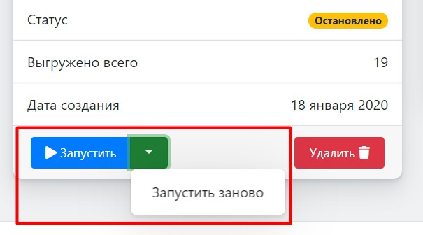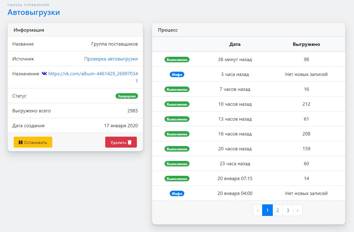 В левой части представлена основная информация и кнопки Остановки/Запуска и Удаления автовыгрузки.