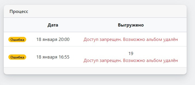В случае возникновения проблем и ошибок при очередном этапе, будет указана информация об ошибке и автовыгрузка будет приостановлена: