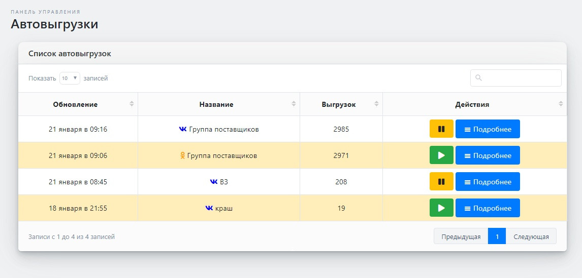 В случае возникновения ошибок при выгрузке или истечения срока оплаченного доступа, Автовыгрузка становится на паузу.