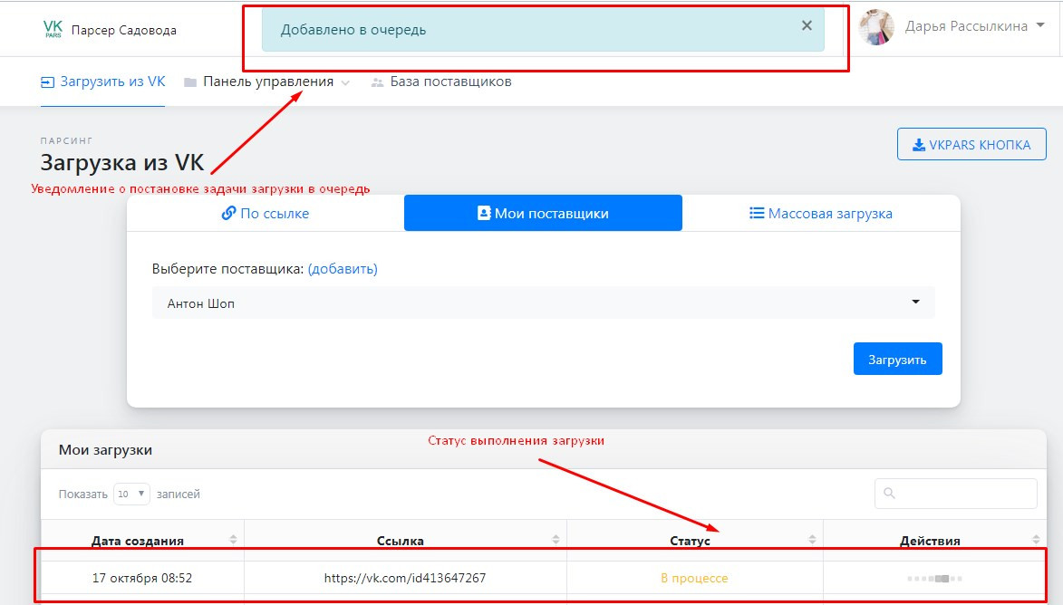 В таблице Ваших загрузок появится новая строчка со статусом последней загрузки.