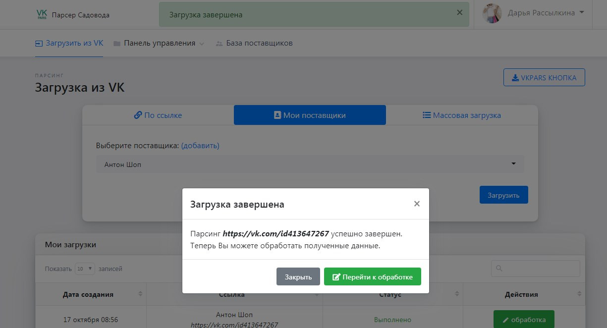По окончанию загрузки Вам будет показано модальное окно с информацией о загрузке. В случае успеха переходите к обработке товаров, нажав на кнопку: