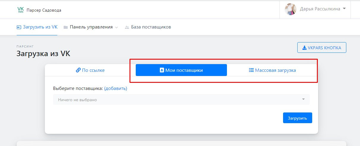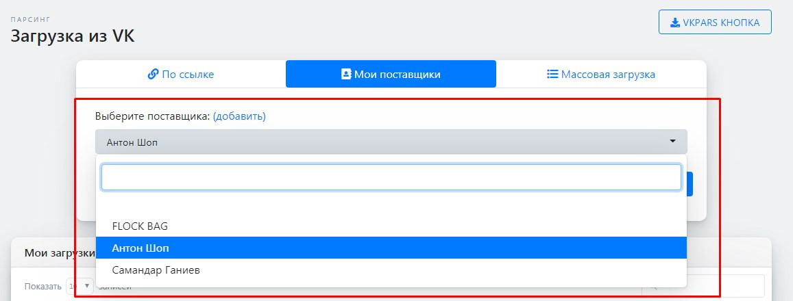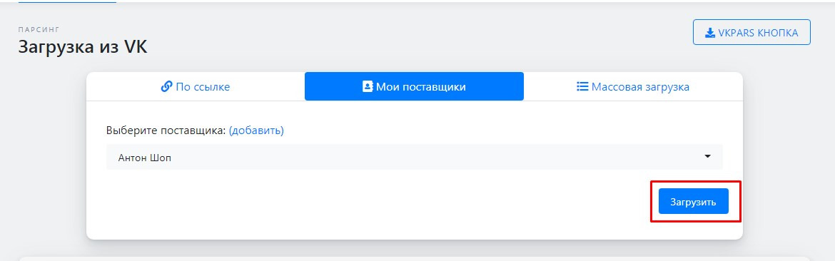 Если у Вас есть сохраненные поставщики или группы поставщиков Вы можете с легкостью загрузить их товары в разделе "Загрузить из VK":